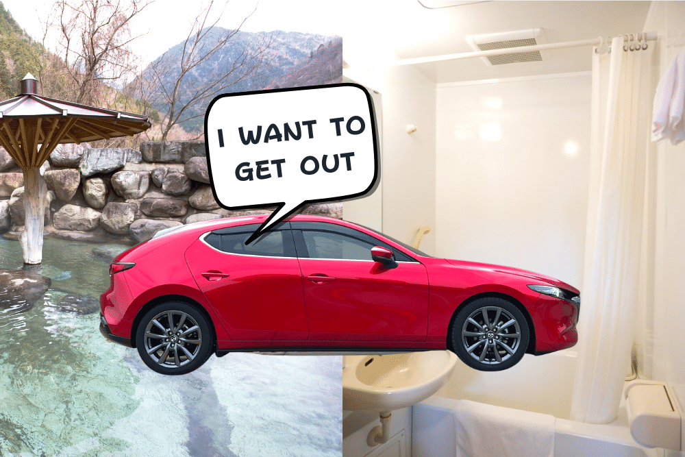 こんなイメージで、外の景色が見づらい(ユニットバスみたいな)MAZDA3の後席に長時間乗っていたら、閉塞感や圧迫感、息苦しさを覚える恐れがあります。